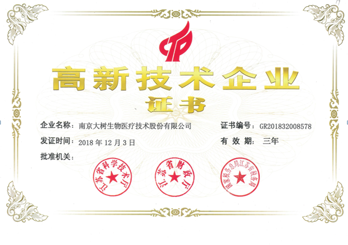 近日,我公司獲得由江蘇省科學(xué)技術(shù)廳、江蘇省財(cái)政廳、國家稅務(wù)總局江蘇省稅務(wù)局聯(lián)合頒發(fā)的“高新技術(shù)企業(yè)”證書,由此正式邁入國家高新技術(shù)企業(yè)行列。南京大樹生物醫(yī)療技術(shù)股份有限公司是一家集研發(fā)、生產(chǎn)、銷售為一體的專業(yè)體外診斷試劑醫(yī)療器械公司,公司秉承“質(zhì)量為先、信譽(yù)為重、以人為本、精益求精”的質(zhì)量方針,通過我們的專業(yè)技能和不懈努力竭力為廣大客戶提供創(chuàng)新優(yōu)質(zhì)的產(chǎn)品及完善的售后服務(wù)!